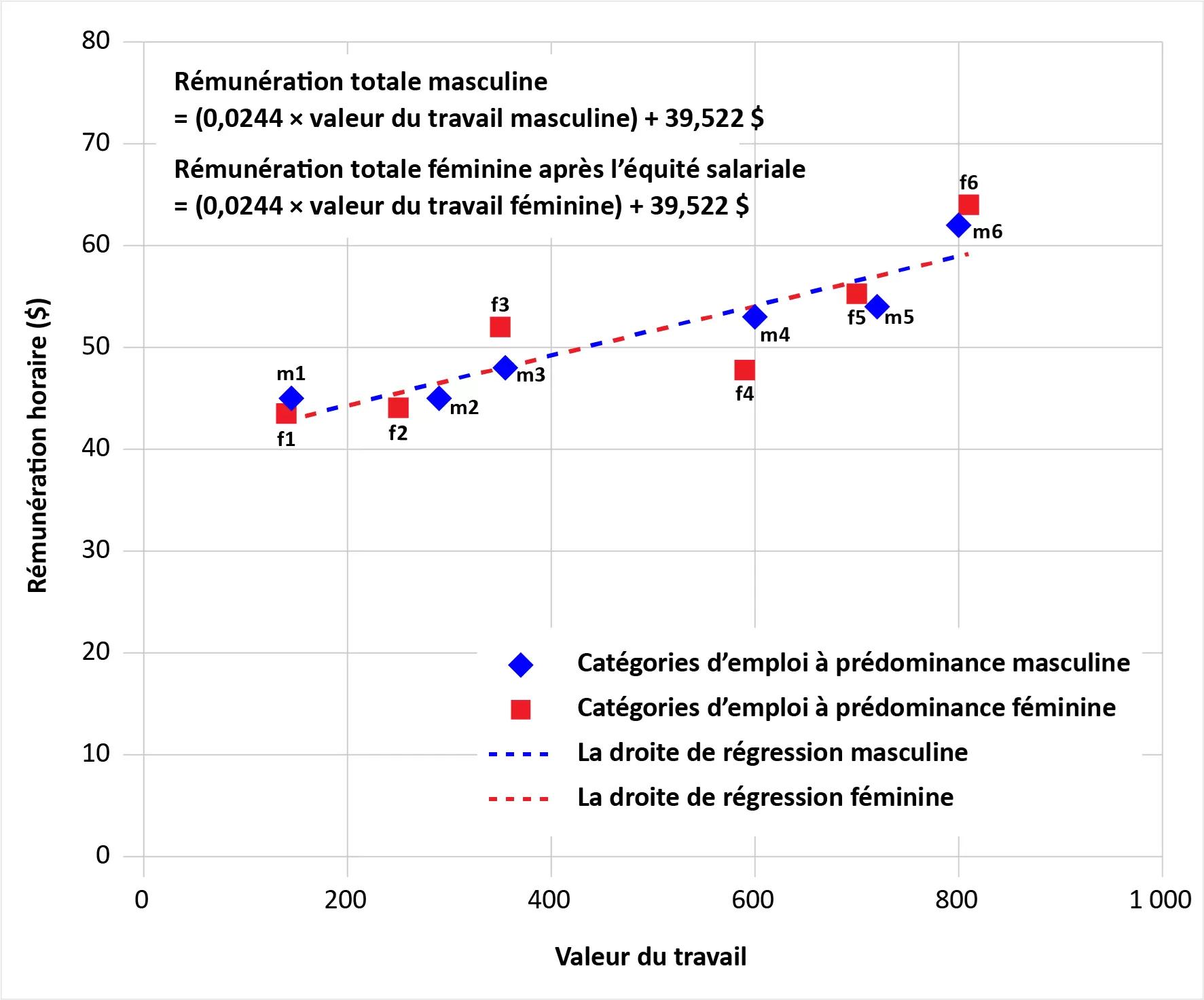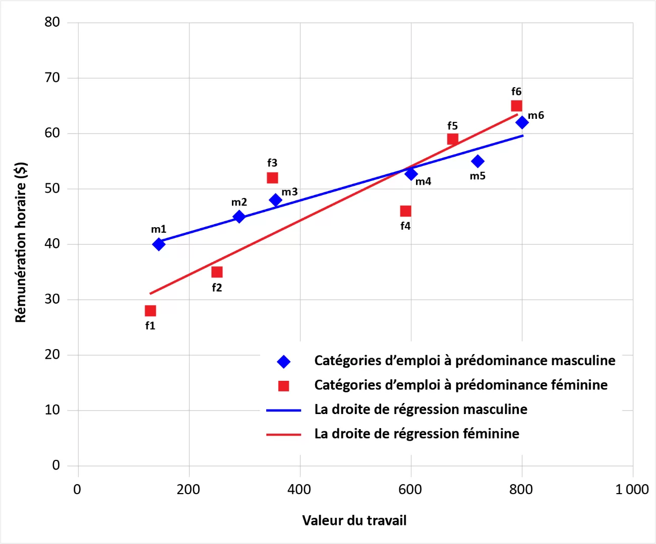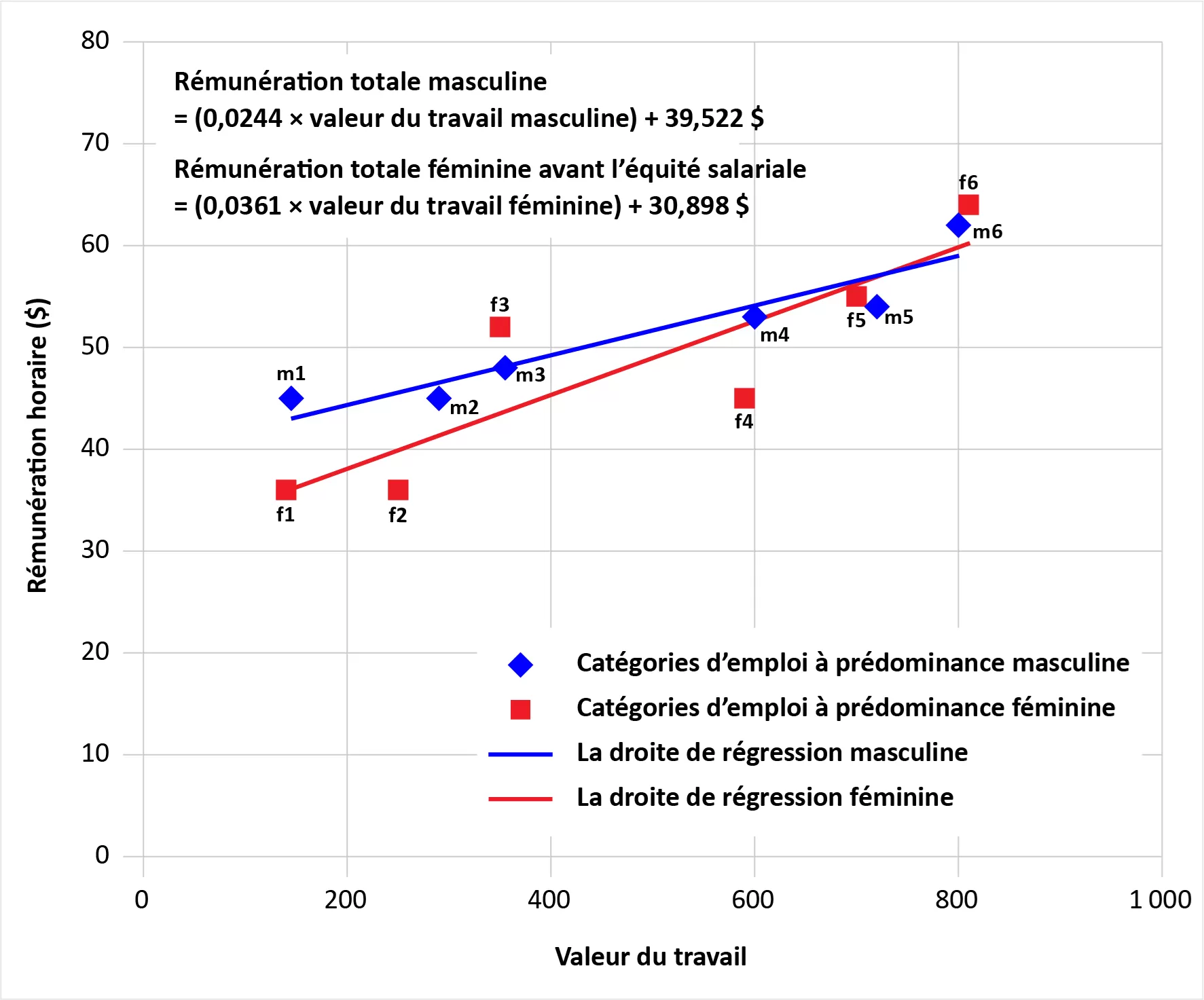 a) une droite de régression est établie à l'égard des catégories d'emploi à prédominance féminine et une autre est établie à l'égard des catégories d'emploi à prédominance masculine;