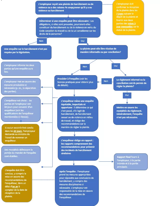 Il y a une autre boîte de texte à droite, reliée à la première boîte par une ligne pointillée. C'est écrit : L'employeur doit confirmer la réception de la plainte dans les 7 jours et fournir aux deux parties des mises à jour mensuelles sur le statut de la plainte.