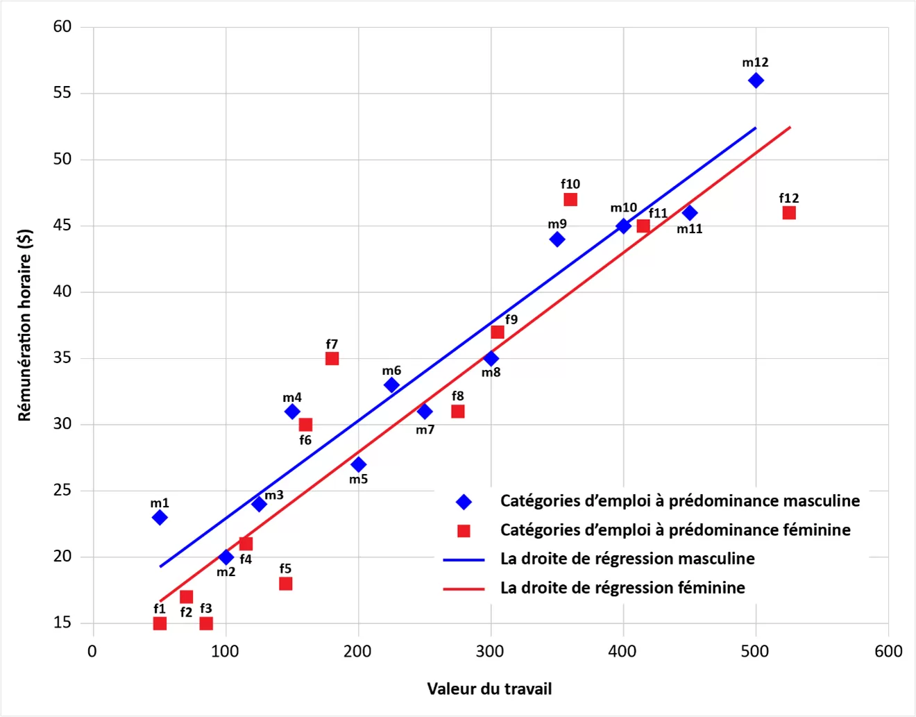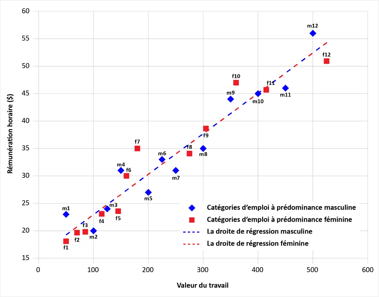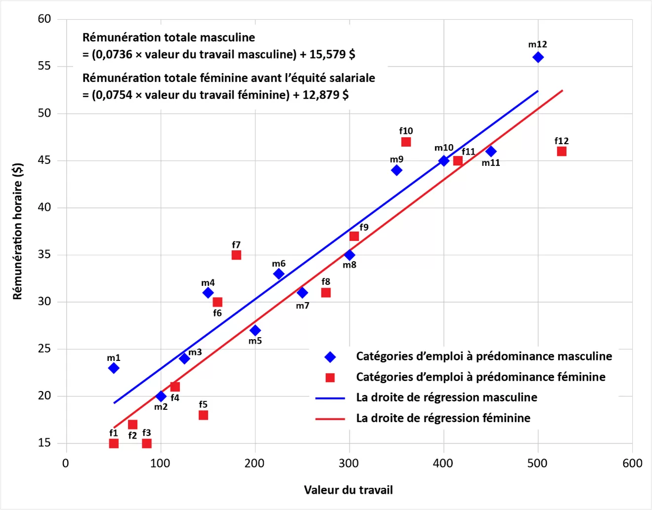 régression représente la relation entre la valeur du travail et le taux de rémunération totale horaire. - La rémunération associée à la catégorie d'emploi à prédominance féminine doit être augmentée que si :