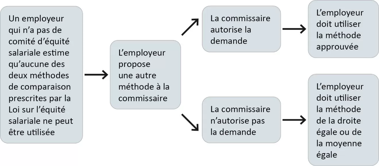Toutefois, la Loi précise également que les employeurs ou les comités d'équité salariale peuvent utiliser d'autres méthodes s'ils estiment que ni la méthode de la moyenne égale ni la méthode de la droite égale ne peut être utilisée. Voir la section 2.1 pour savoir ce qu'il faut faire lorsque le comité d'équité salariale décide d'utiliser une autre méthode. Voir la section 2.2 pour savoir ce qu'il faut faire lorsqu'un employeur n'ayant pas de comité d'équité salariale décide d'utiliser une autre méthode.